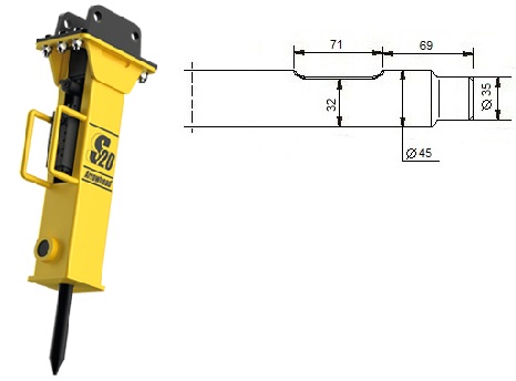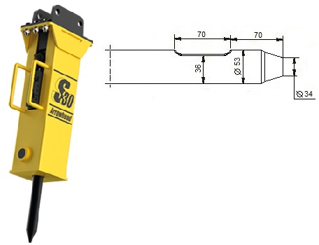 Kompatibel mit den Modellen Arrowhead S20. Die Modelle R40 bis R80 ersetzen die älteren Modelle S10, S20, S40 und S60. Die Schneide des Meißels steht quer zum Baggerausleger, außer beim Asphaltspatens, der parallel dazu steht.
