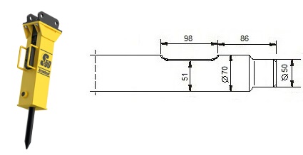 Kompatibel mit den Modellen Arrowhead S50. Die Modelle R40 bis R80 ersetzen die älteren Modelle S10, S20, S40 und S60. Die Schneide des Meißels steht quer zum Baggerausleger, außer beim Asphaltspatens, der parallel dazu steht.